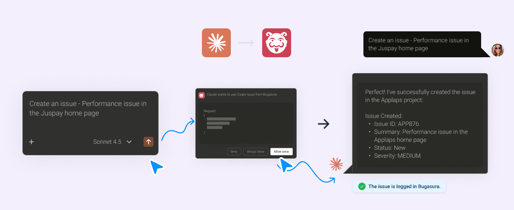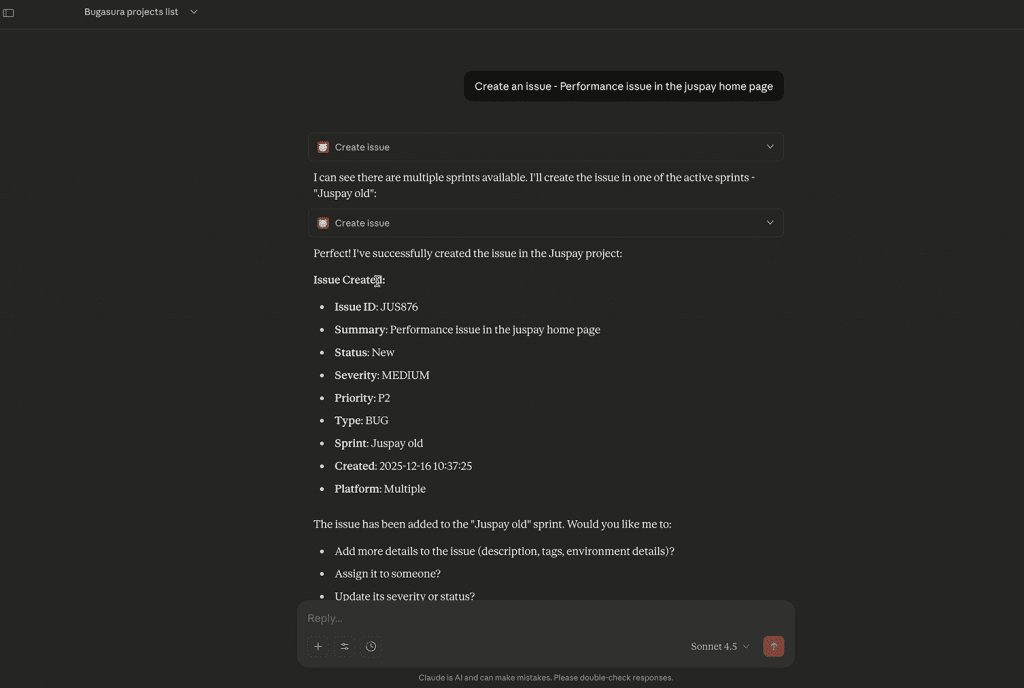 Claude converts this intent into an MCP tool call, applies the correct project and sprint context, and instantly logs the issue in Bugasura.