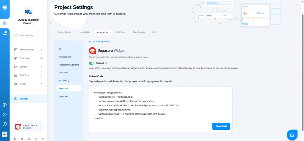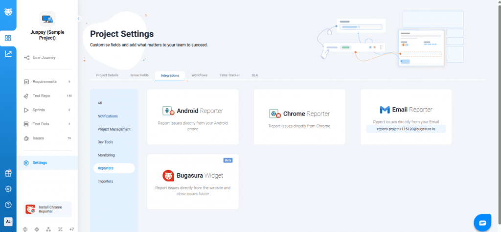 Go to the Project Settings of the private project where you want issues to be reported. Under Integrations, select Reporters, where you’ll find the Bugasura Widget.