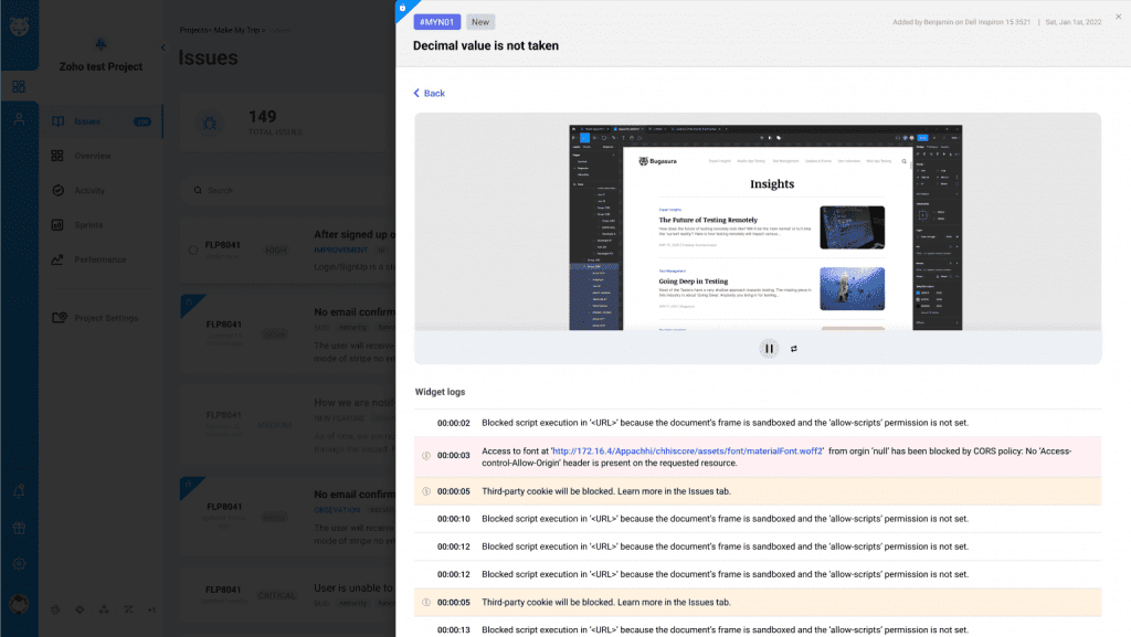 Users can click Report an issue, enter an issue summary, and submit it directly to the private project. The widget automatically captures session replays and console logs, which are attached to the issue in Bugasura, making it easier for teams to track, understand, and resolve issues efficiently.