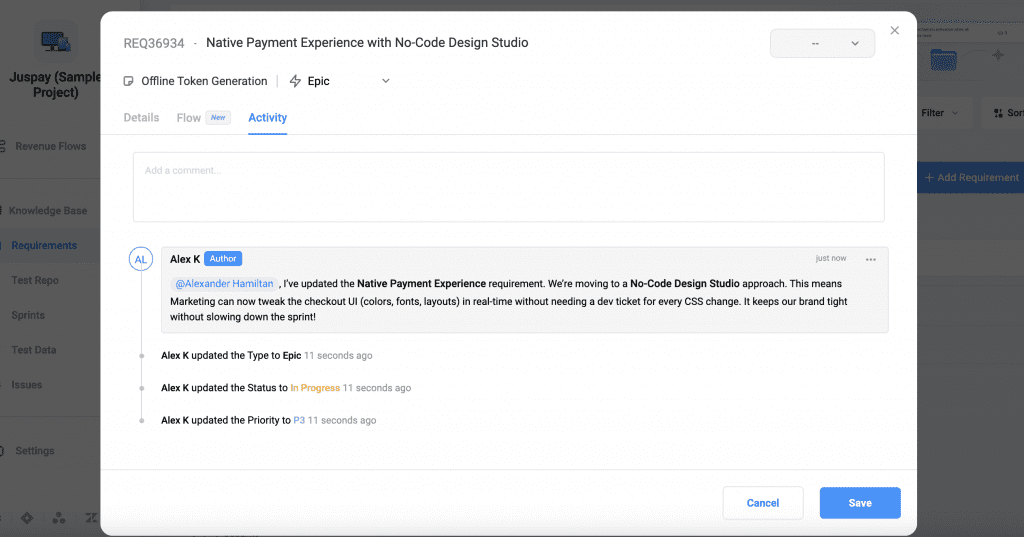 Open any Requirement in your project and navigate to the Activity section to view updates, track history, and collaborate with your team.