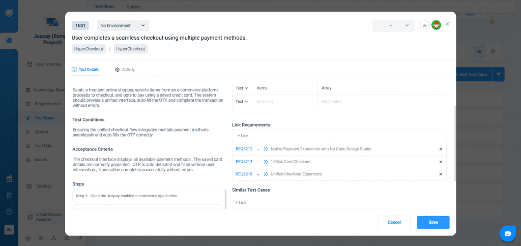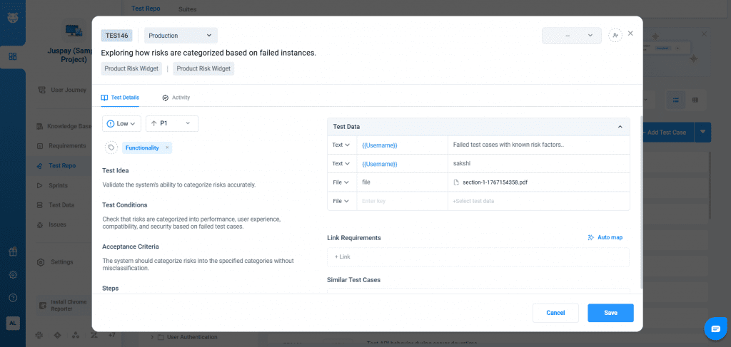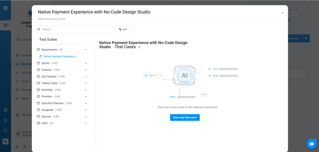 With this update, users can automatically map related Requirements and Test Cases directly from create and edit pop-ups across modules. AI analyzes the context and suggests relevant entities instantly, reducing manual effort while improving coverage and traceability.