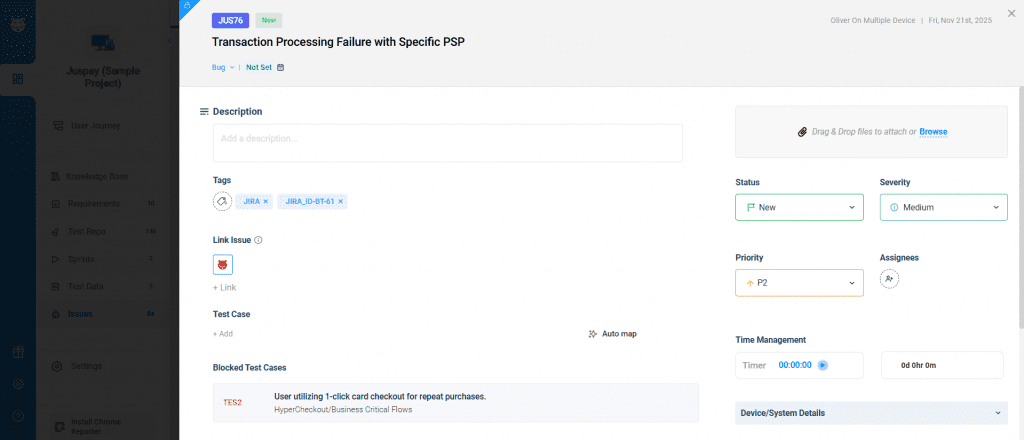 During Issue creation or editing, use Gen AI Auto-map Test Cases. Suggested Test Cases appear instantly. Review and confirm before saving to maintain accurate traceability.