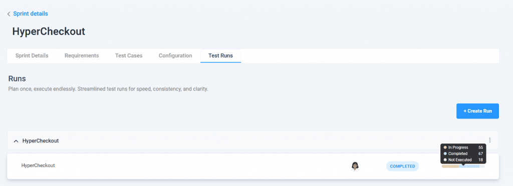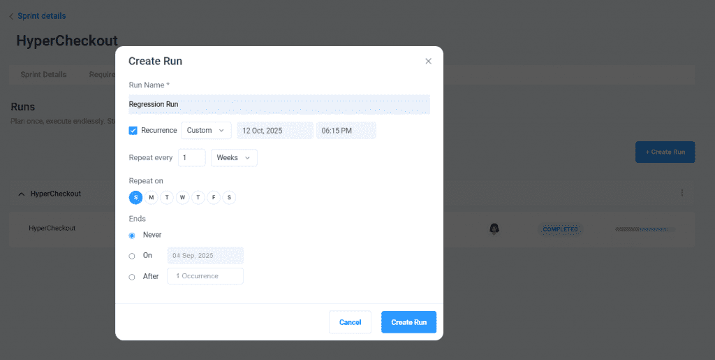 While creating it, you can define the recurrence pattern — daily, weekly, or a custom schedule. Once saved, the recurring run will appear in your sprint’s run list, ready to be executed whenever needed, without having to recreate it each time.