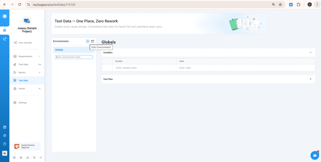 Open the Test Data module and create an environment, then add test data in key–value pairs. You can update or delete the environment anytime.