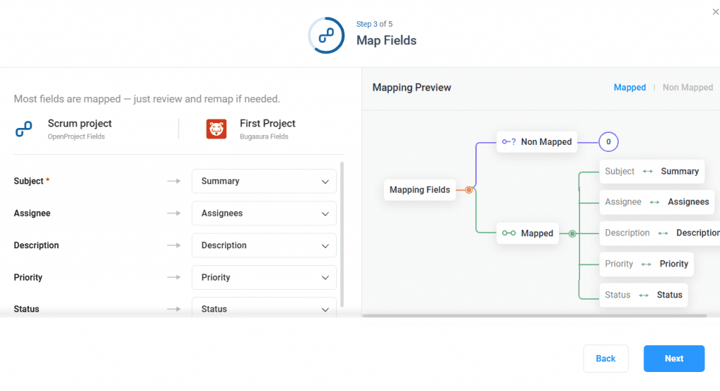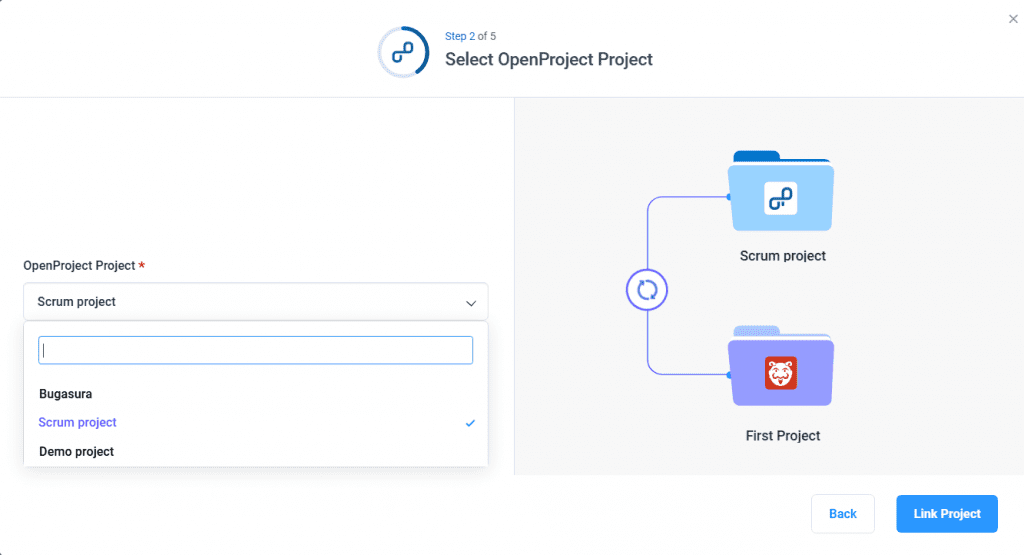 Next, you can select the project you want to connect with Bugasura. After that, you’ll be able to map fields and choose which issues should sync to OpenProject.