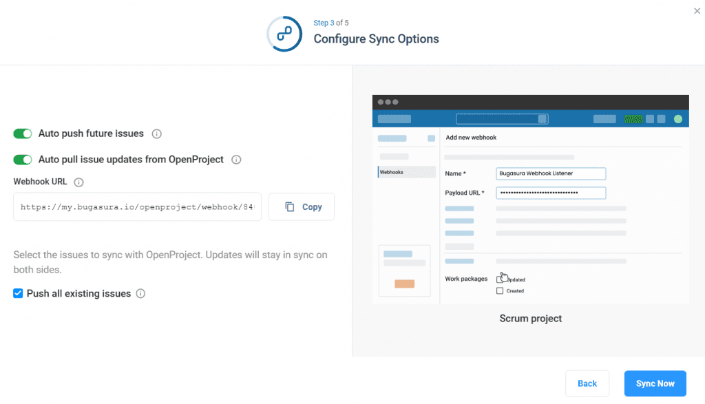 Note*: To enable Two-Way Sync or Auto Pull of issue updates from OpenProject into Bugasura, you’ll need to configure the provided webhook URL in your OpenProject settings.