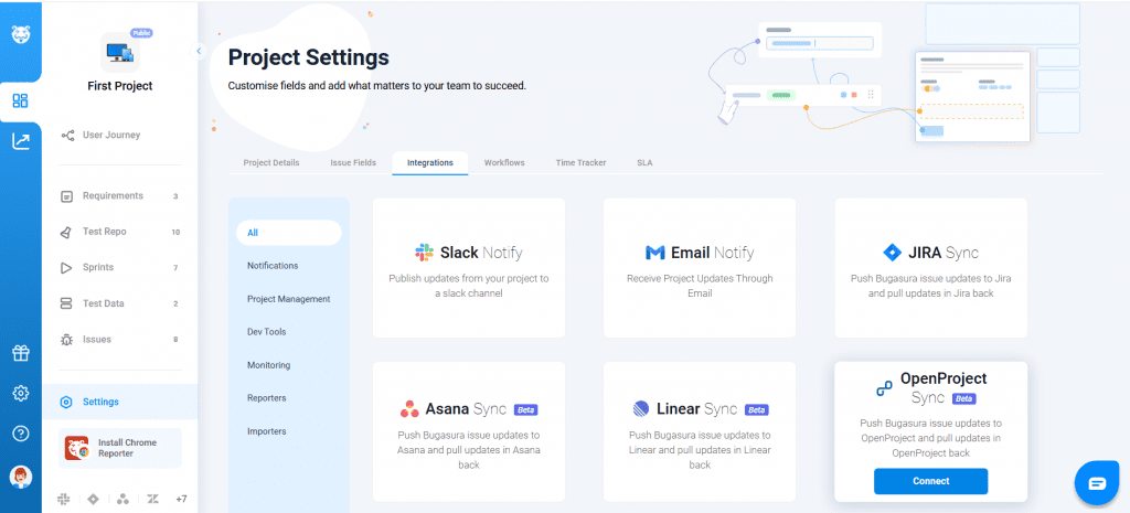 With Bugasura’s OpenProject Integration, you can push issues directly from Bugasura into OpenProject projects. This ensures your QA, product, and engineering teams stay perfectly in sync — with no duplication of effort or manual updates.
