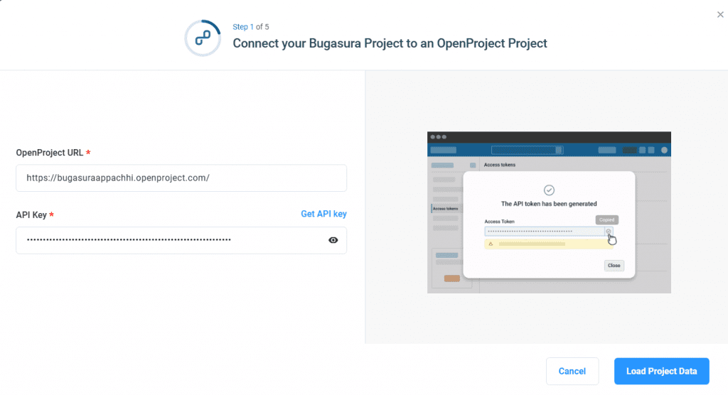 On the Project Integration page, you will see a OpenProject Integration option. By clicking on it, a OpenProject Integration wizard popup will open. In the first step, you will be asked to provide API Token.