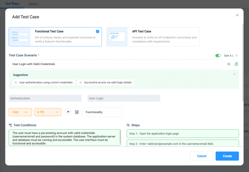 - Go to the Test Cases tab, pick or create a folder, and click “Add Test Case.” Select Functional or API, enter details, and hit Save. With GenAI on, details are auto-filled with smart suggestions to improve your test case summary.