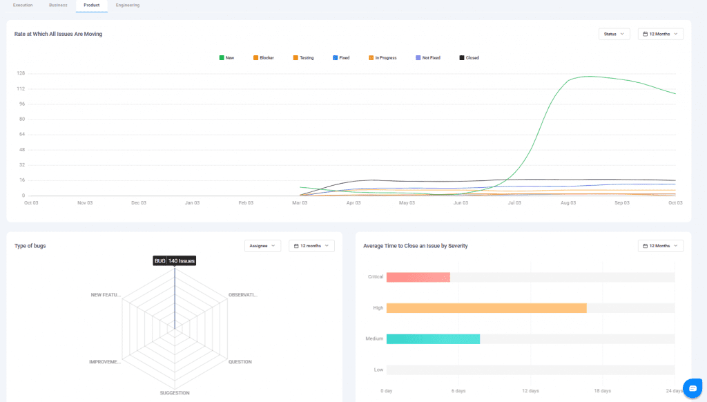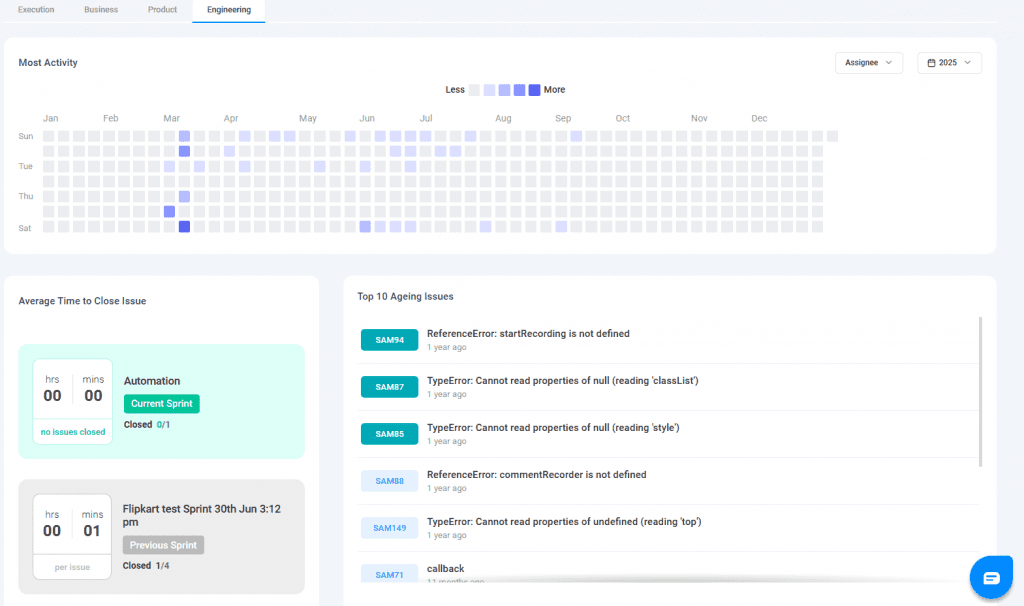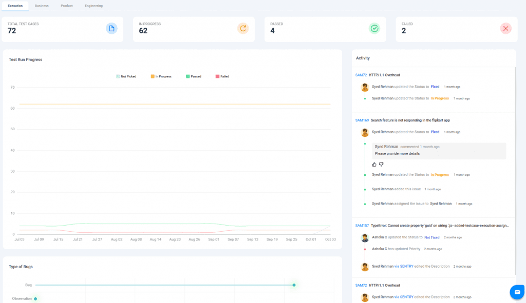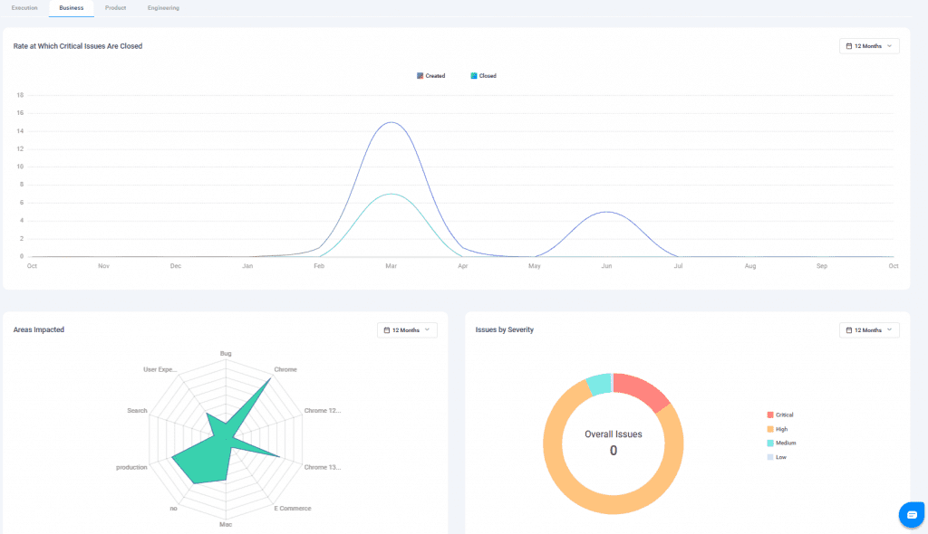 - Based on test case execution and bug reports, the Reports page provides tailored views for Business, Product, and Engineering teams — ensuring each gets the most relevant insights.
